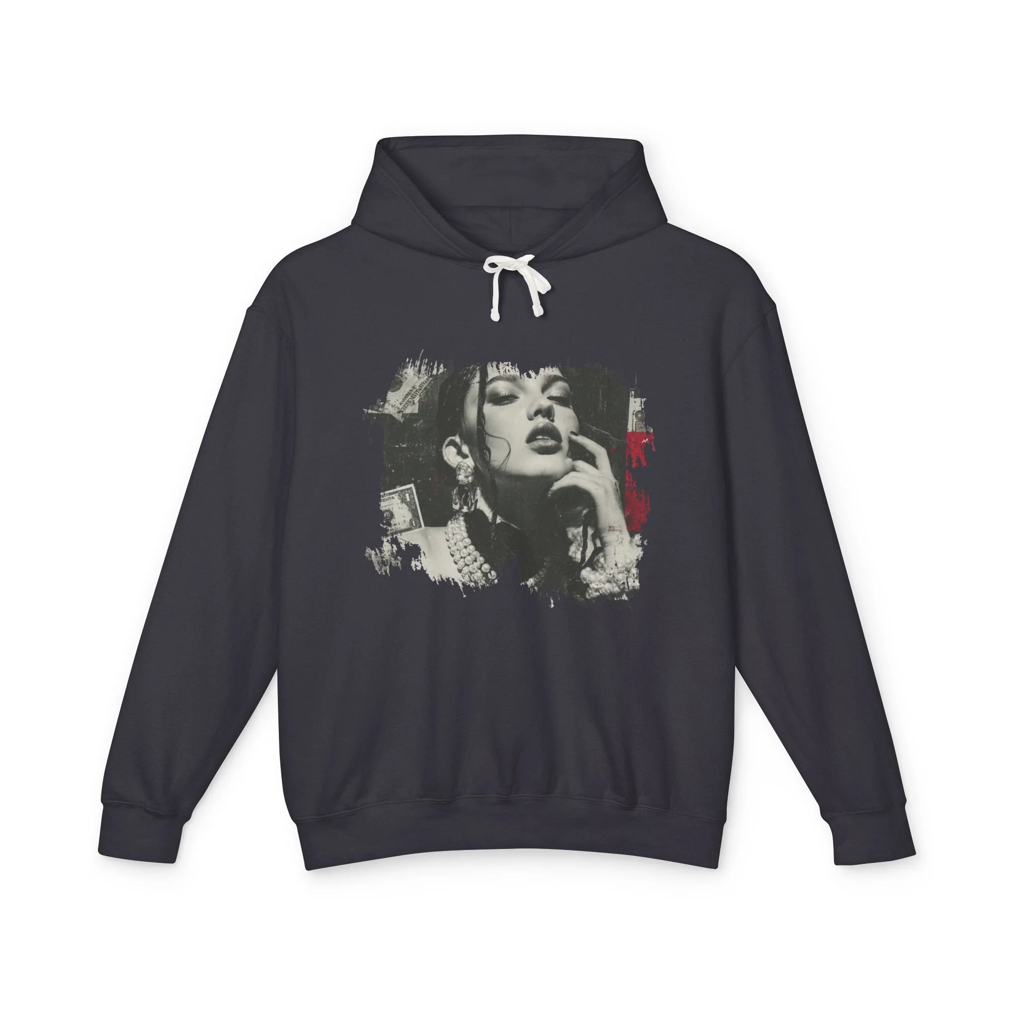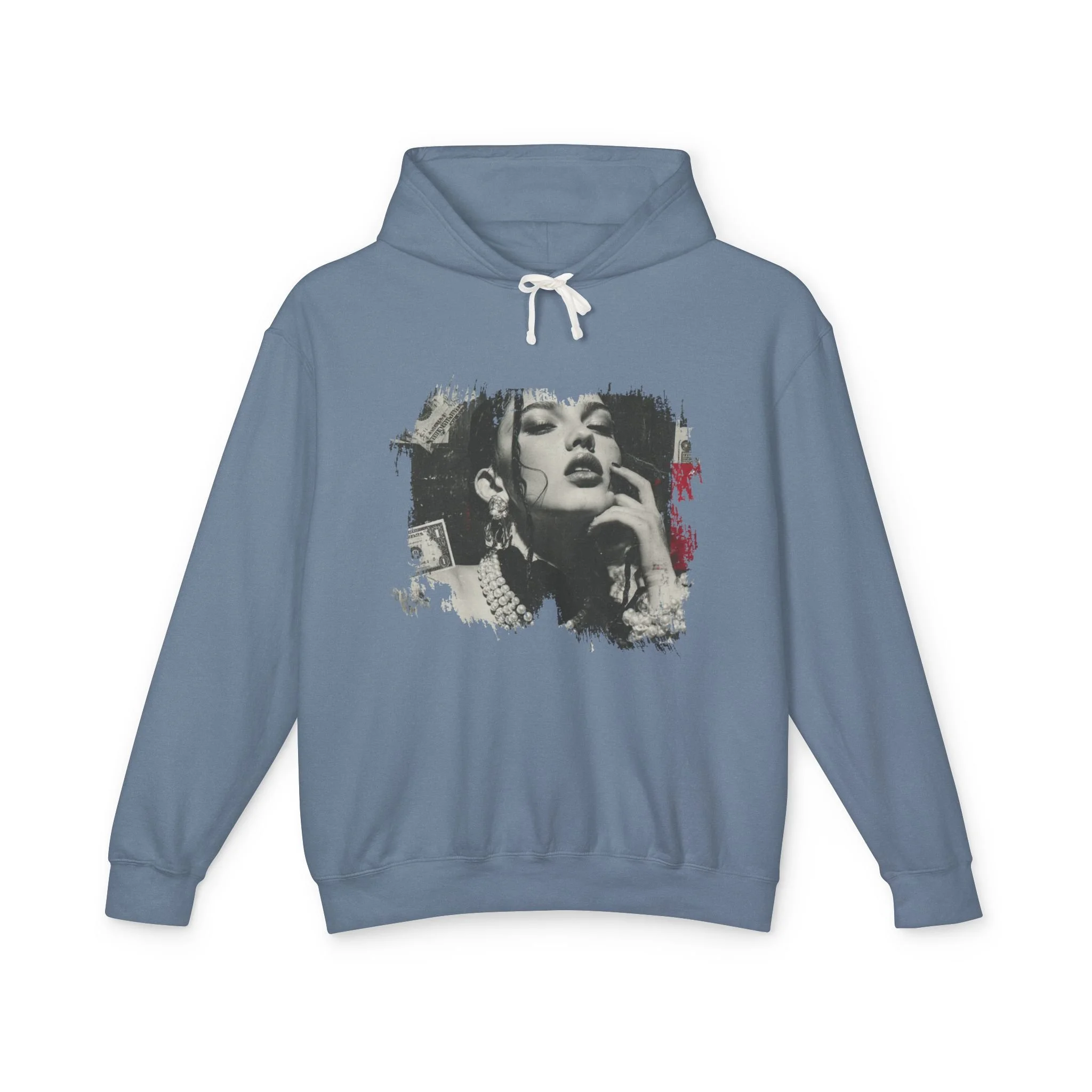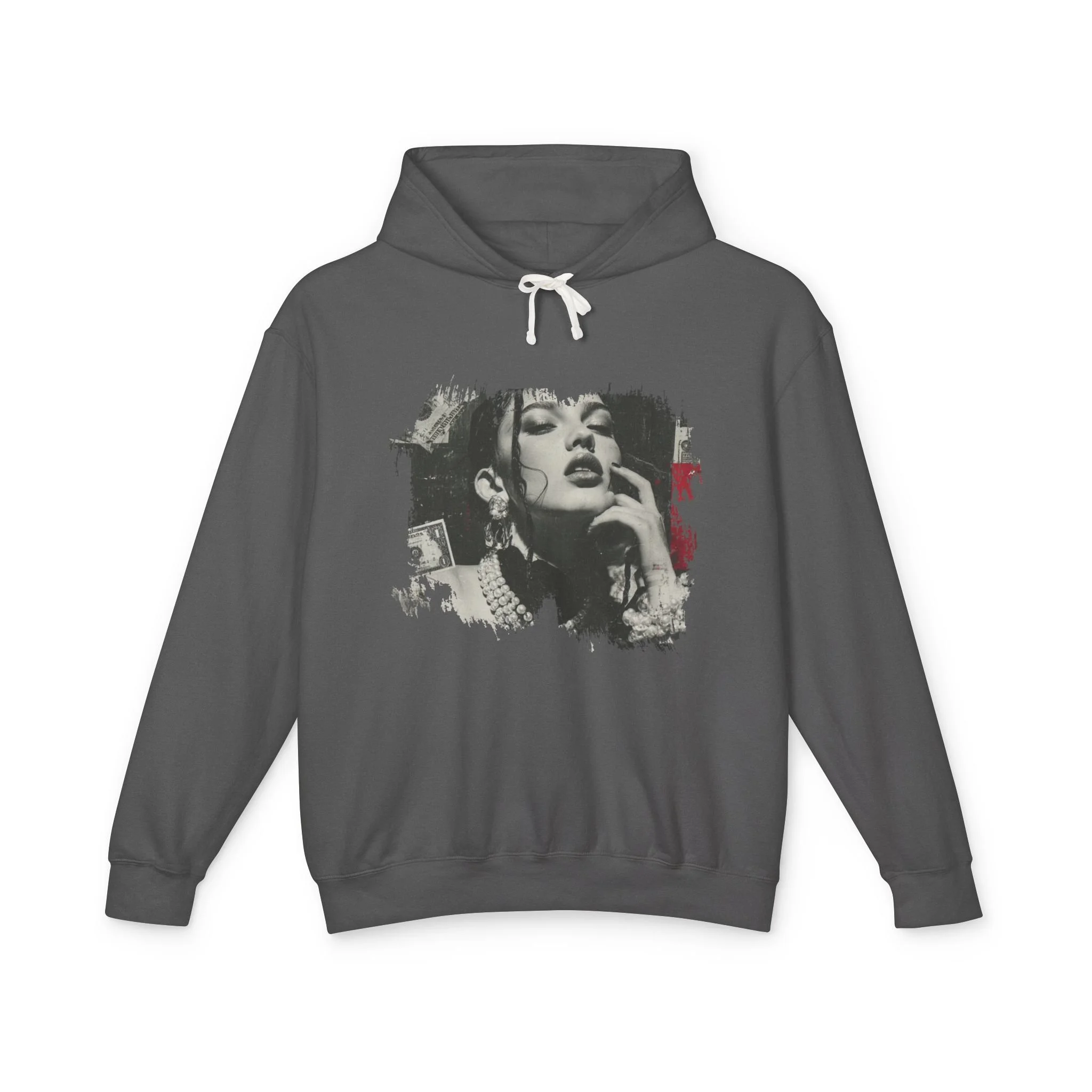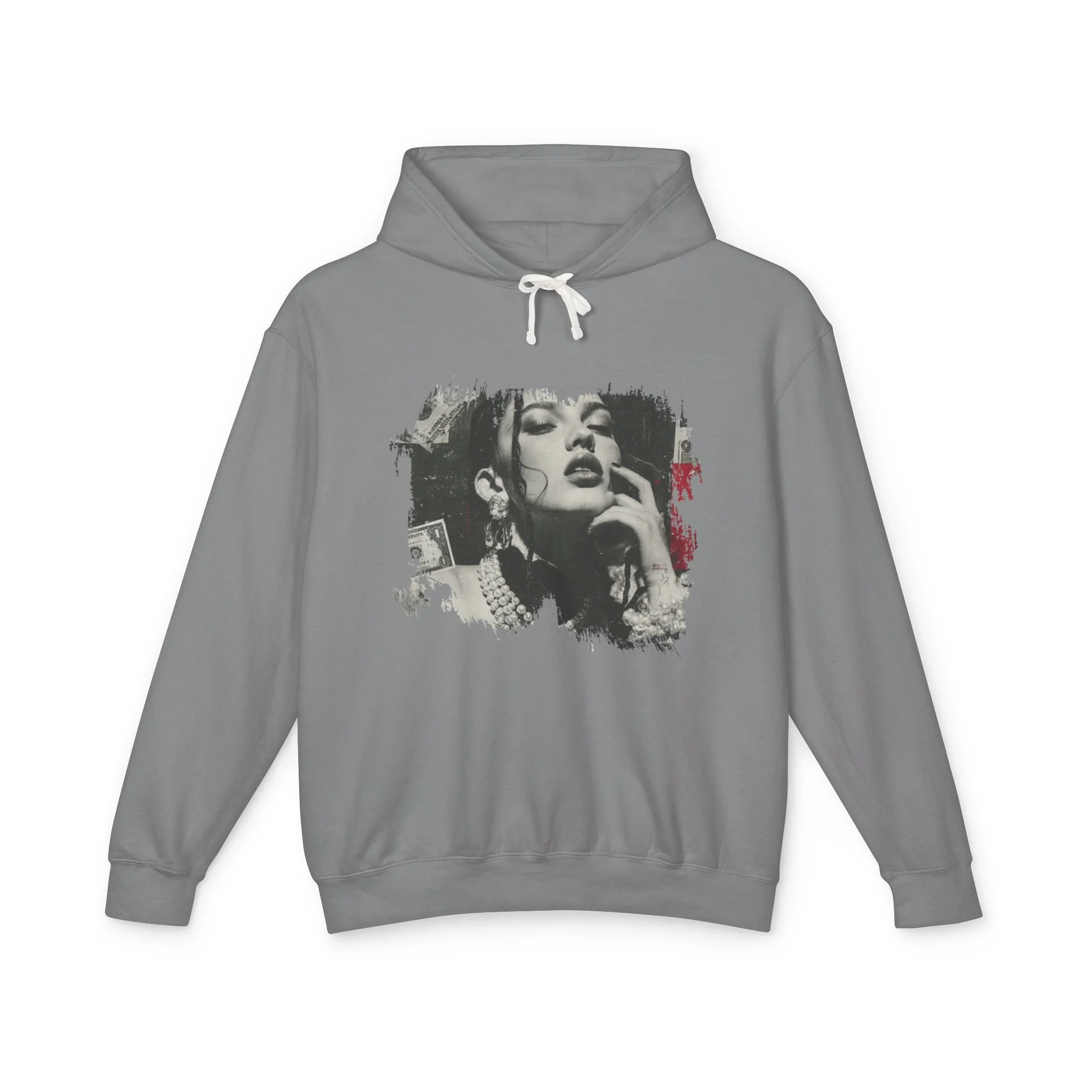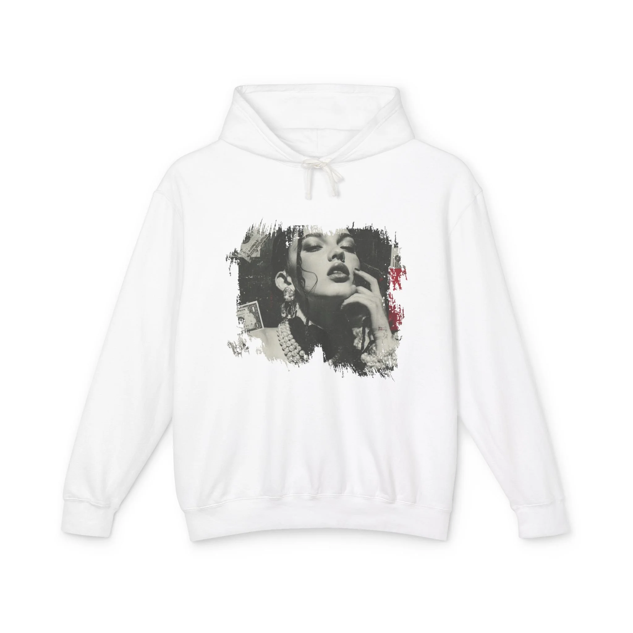 A lightweight cotton hooded sweatshirt that reads like wearable art. The soft, ring-spun US cotton drapes with a relaxed silhouette while a jersey-lined hood and natural flatcord add clean, classic details. The front features a gritty, high-contrast portrait graphic with distressed edges and subtle red accents — an urban, vintage-inspired vibe that feels equal parts gallery piece and late-night staple. It layers easily over tees or under jackets, moves with you thanks to rolled-forward shoulders, and carries eco-minded credentials through OEKO-TEX low-impact dyes and membership in the U.S. Cotton Trust Protocol.
